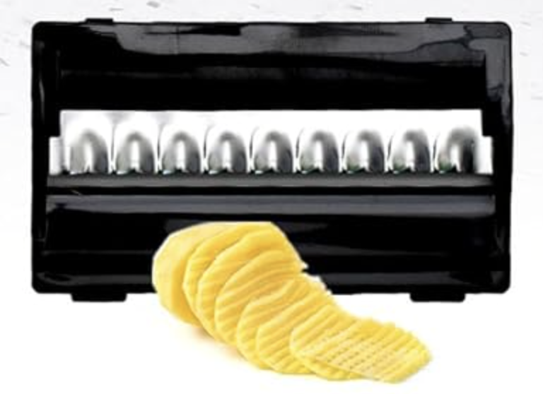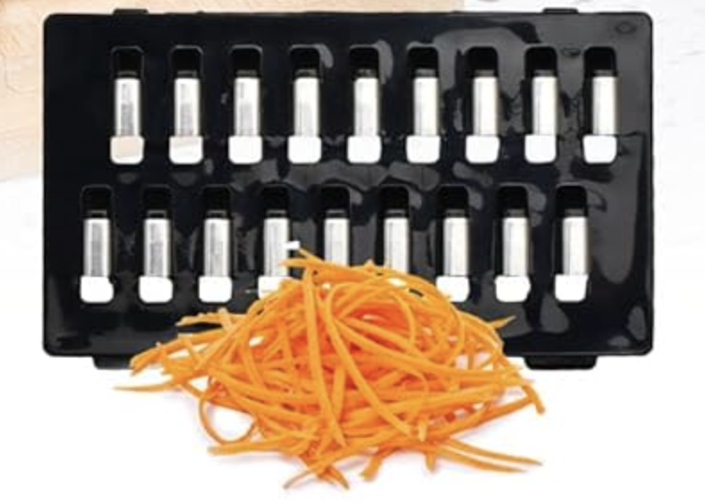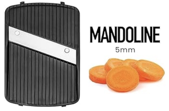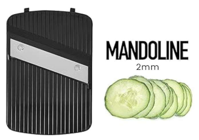 The Cook Smarter 9-in-one mandolin is a powerful tool used to slice and grate food. It boasts 8 versatile blade attachments and is complemented by a julienne peeler. Read all about its blades and functions in the description below.